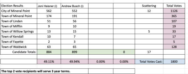 Results are in for the Mineral Point School Board election April 7, 2026. These are official and were canvassed Friday, April 10 at 10 am in the District Office.